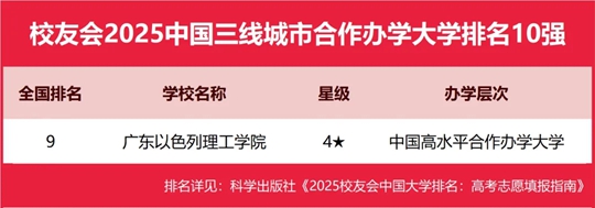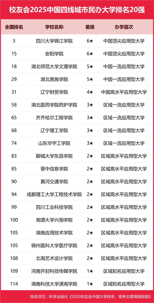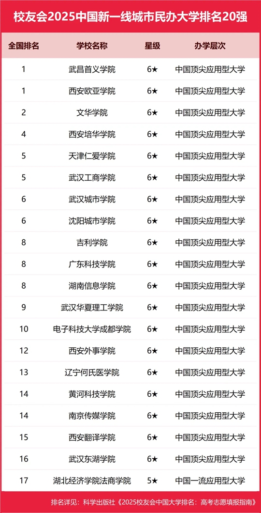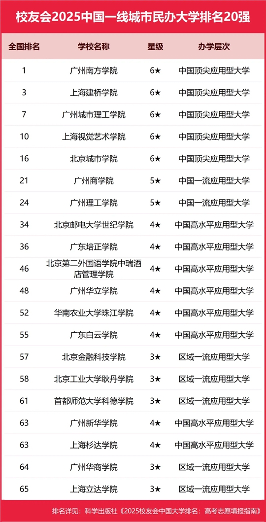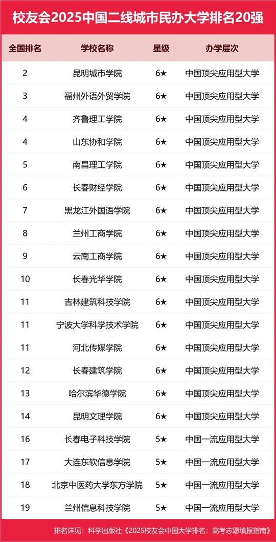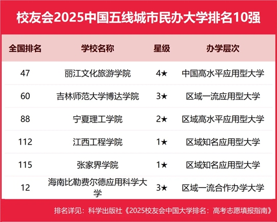 在校友會2025中國各線城市民辦大學排名中,廣州南方學院、武昌首義學院、西安歐亞學院、昆明城市學院、三亞學院、四川大學錦江學院、麗江文化旅游學院分列校友會2025中國一線城市、新一線城市、二線城市、三線城市、四線城市和五線城市民辦大學排名第一。