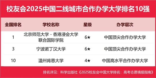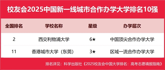 在校友會2025中國各線城市合作辦學大學排名中,香港中文大學(深圳)、西交利物浦大學、北京師范大學——香港浸會大學聯合國際學院、廣東以色列理工學院、海南比勒費爾德應用科學大學分列校友會2025中國一線城市、新一線城市、二線城市、三線城市、四線城市和五線城市合作辦學大學排名第一。