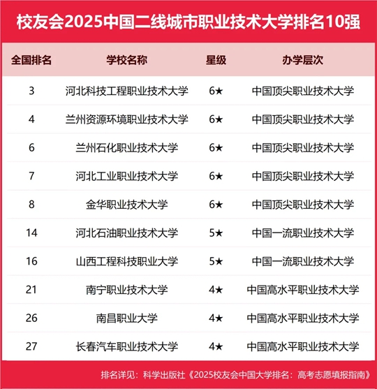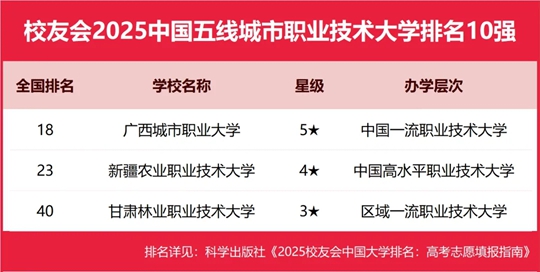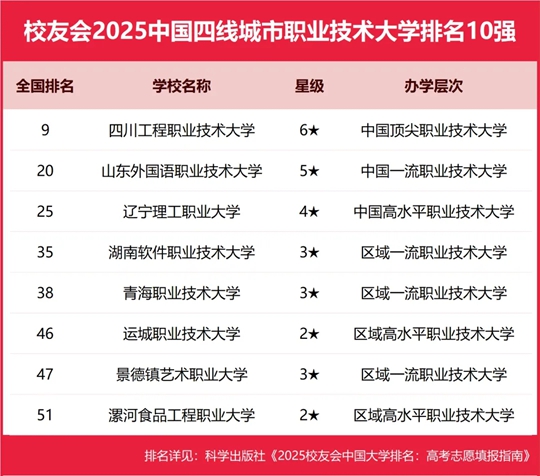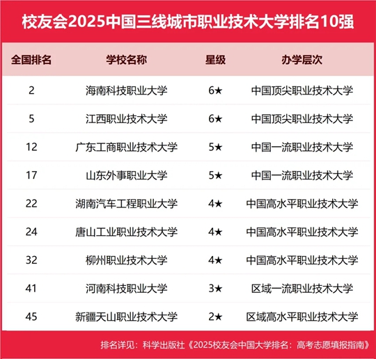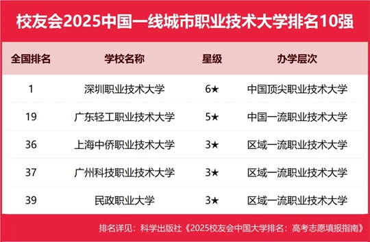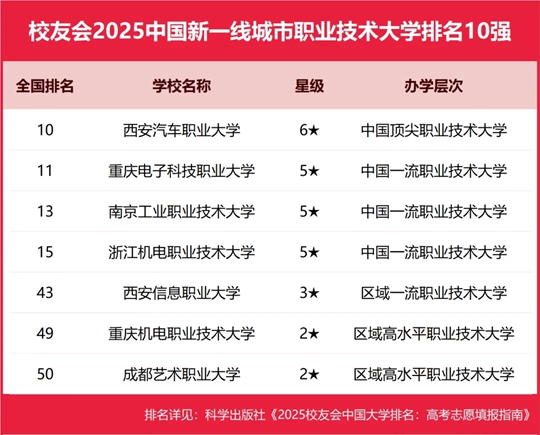 在校友會2025中國各線城市職業技術大學排名中,深圳職業技術大學、西安汽車職業大學、河北科技工程職業技術大學、海南科技職業大學、山東外國語職業技術大學、廣西城市職業大學分列校友會2025中國一線城市、新一線城市、二線城市、三線城市、四線城市和五線城市職業技術大排名第一。