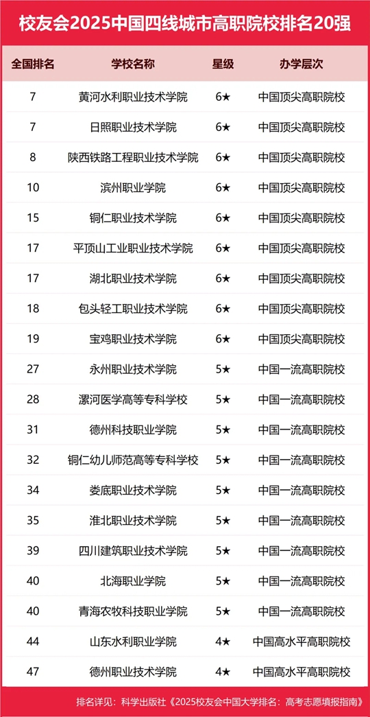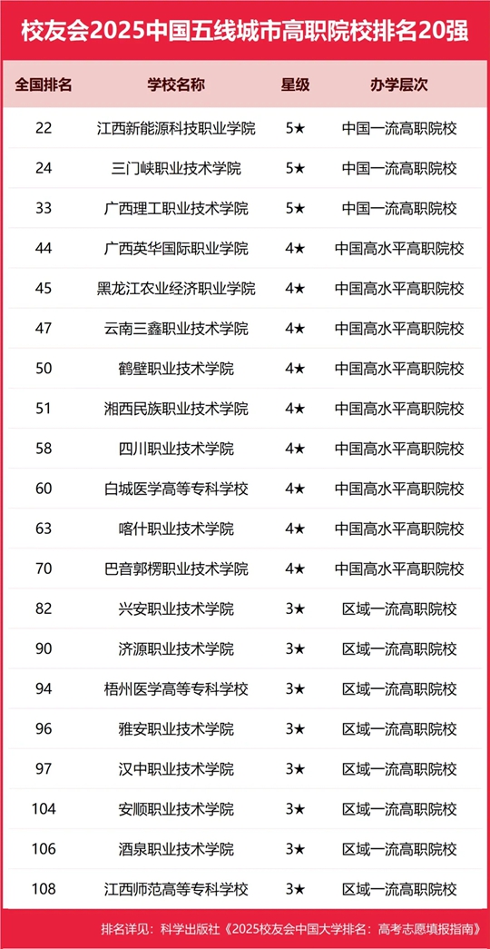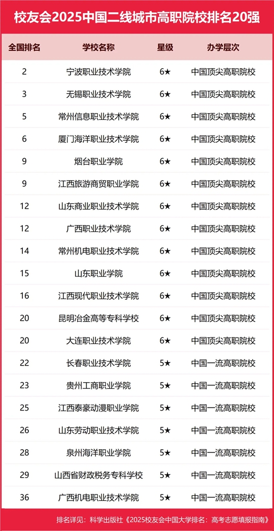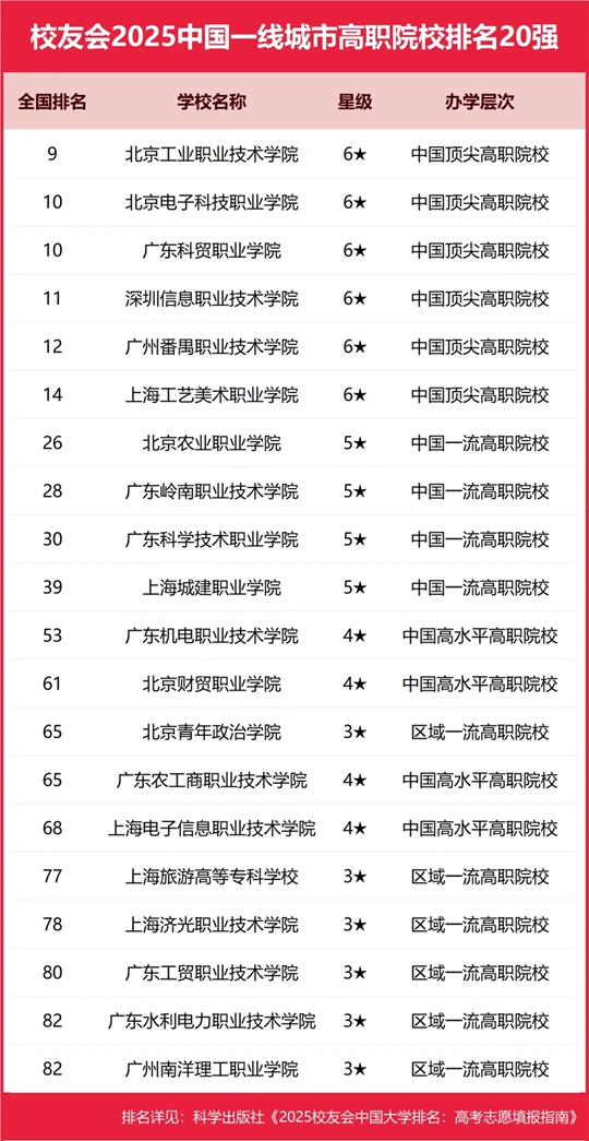 在校友會2025中國各線城市高職院校排名中,北京工業職業技術學院、合肥職業技術學院、浙江金融職業學院、寧波職業技術學院、蕪湖職業技術學院、黃河水利職業技術學院、日照職業技術學院、江西新能源科技職業學院分列校友會2025中國一線城市、新一線城市、二線城市、三線城市、四線城市和五線城市高職院校排名第一。