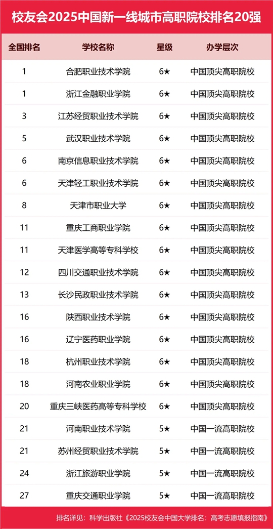 北京師范大學——香港浸會大學聯合國際學院高居2025中國合作辦學大學排名第一。深圳職業技術大學、海南科技職業大學名列2025中國職業技術大學排名冠亞軍。蕪湖職業技術學院、合肥職業技術學院和浙江金融職業學院雄居2025中國高職院校排名第一。