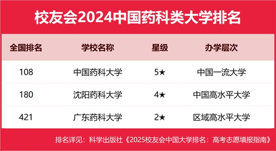 榜單顯示,在校友會2025中國大學排名中,中國藥科大學全國排名第108名,雄居校友會2025中國藥科類大學排名第一。沈陽藥科大學第二,廣東藥科大學第三。