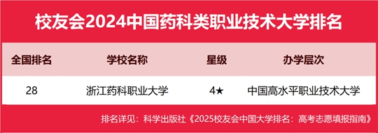 在校友會2025中國職業技術大學排名中,浙江藥科職業大學全國排名第28名,穩居校友會2025中國城市職業技術大學排名首位。