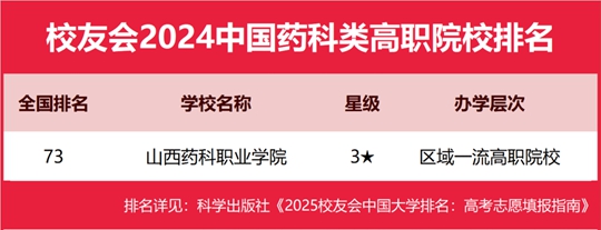在校友會2025中國高職院校排名中,山西藥科職業學院全國排名第73名,名列校友會2025中國城市高職院校排名冠軍。