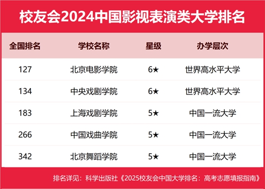 校友會2025中國影視表演類大學排名,北京電影學院、青島電影學院、廣東亞視演藝職業學院第一 |
