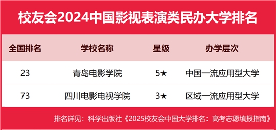 青島電影學院位列2025中國影視表演類民辦大學排名榜首,四川電影電視學院第二