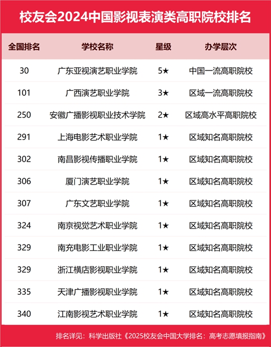 廣東亞視演藝職業學院勇奪2025中國影視表演類高職院校排名第一,安徽廣播影視職業技術學院第三