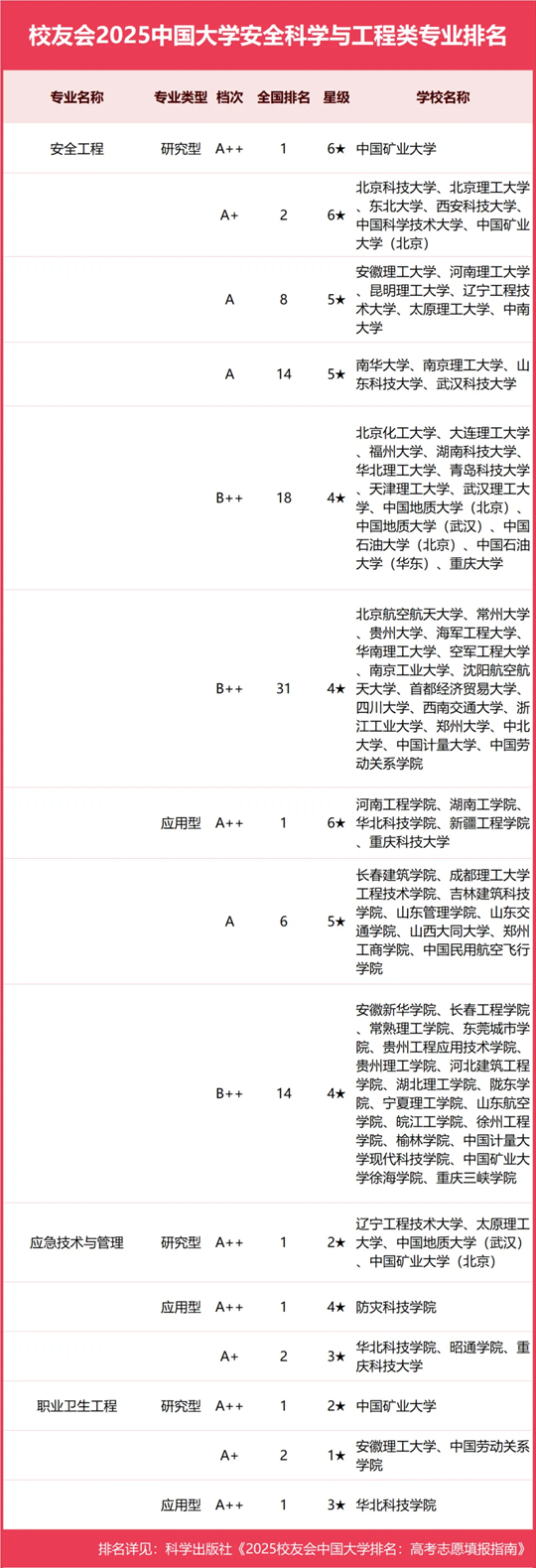 校友會2025中國大學安全科學與工程類專業排名(研究型)