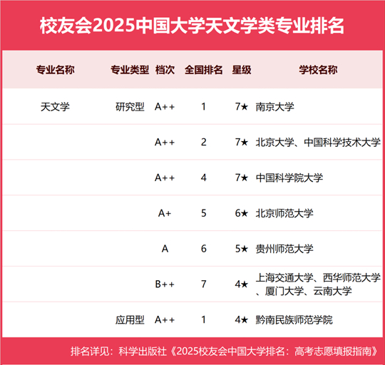 校友會2025中國大學天文學類專業排名,中國科學技術大學、黔南民族師范學院第一 |