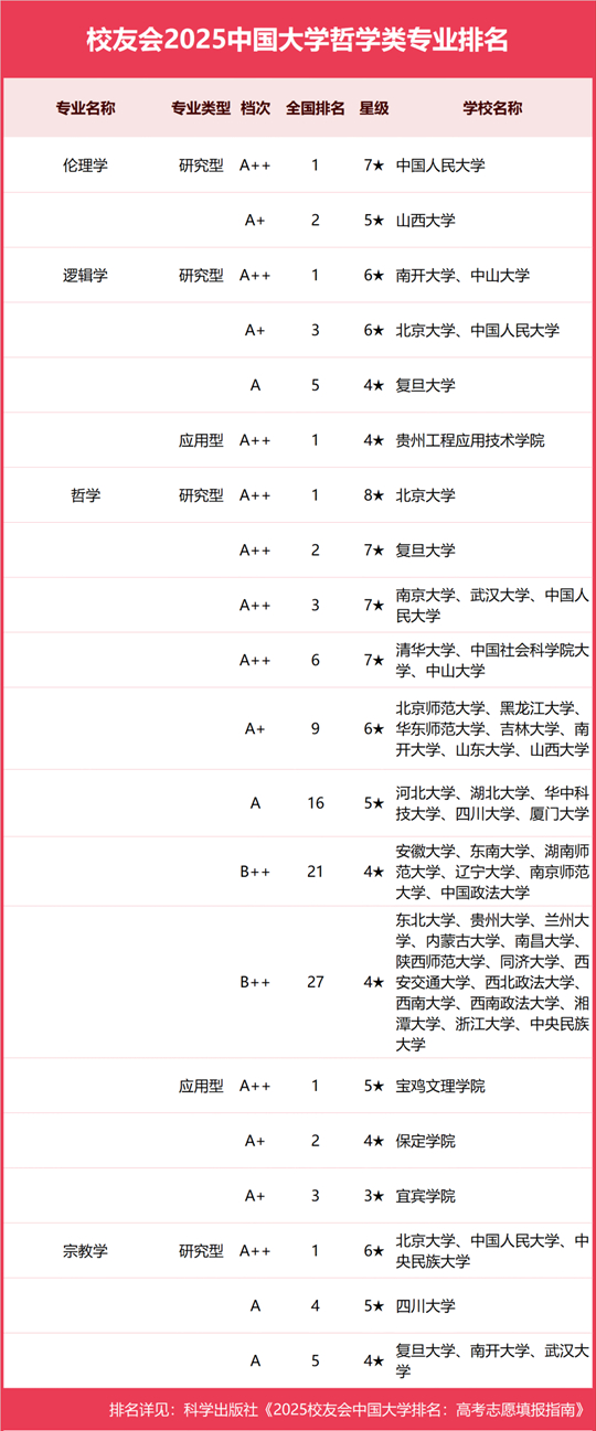 校友會2025中國大學哲學類專業排名,北京大學、貴州工程應用技術學院第一 |