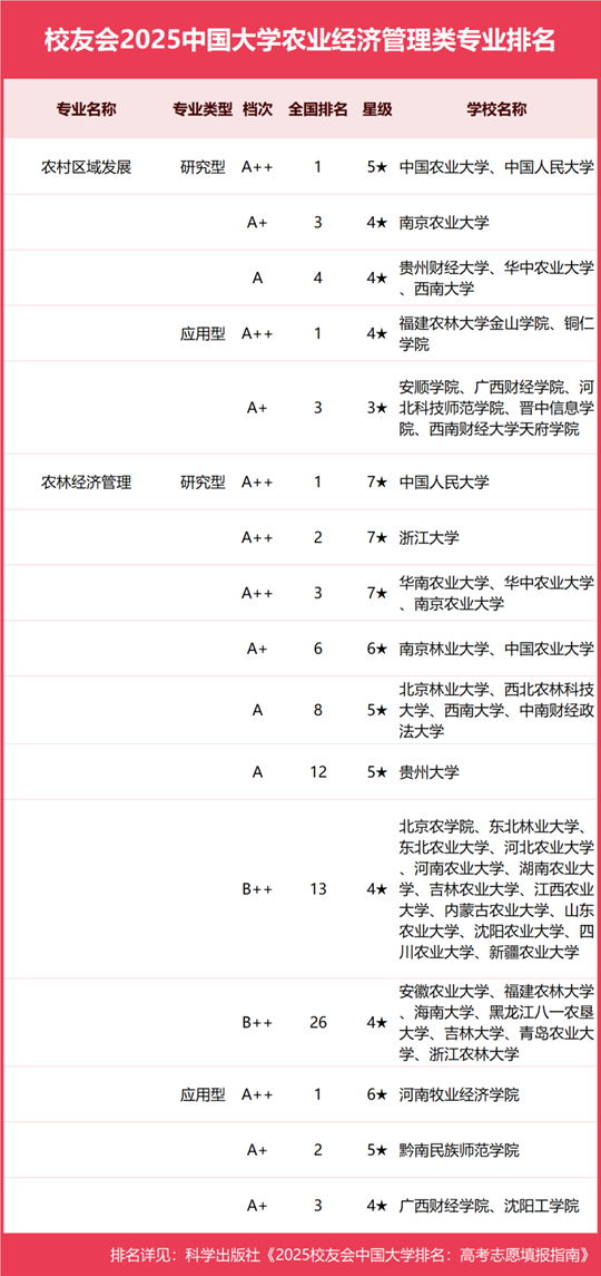 校友會2025中國大學農業經濟管理類專業排名(研究型)