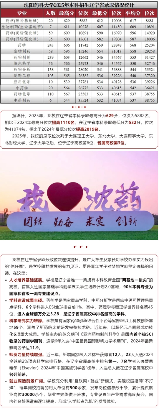 沈陽藥科大學2025年遼寧本科錄取分數位次持續攀升