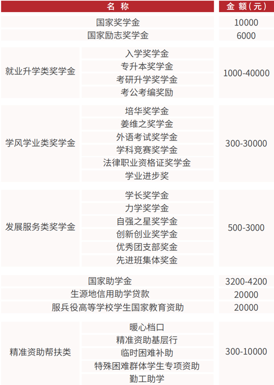 學校堅持公益性辦學,在教育教學質量持續提升的背景下,學費始終保持在全省同類高校較低水平,學校還建立了“獎、貸、助、補、勤、減、免、償”八位一體的學生資助體系,力爭讓每—名培華學子都能順利完成學業。近年來,每年受獎助學金人數13000余人,獎助學金覆蓋率達58%。