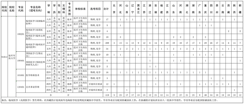 招生對象為在提前批錄取院校中報考我校的普通高中應屆和往屆畢業生。在入學后3個月內經復查復審合格的,按照有關規定辦理入伍手續,家屬享受軍屬待遇。在校期間享受軍隊院校供給制學員待遇,免交學雜費和住宿費,統一著軍裝,每月發放伙食費和津貼。學習期滿,完成人才培養方案規定課程,綜合考核合格,符合畢業和學位授予條件者,頒發陸軍軍醫大學本科畢業證書和學士學位證書;八年制(本博連讀)學員,符合畢業和學位授予條件者,頒發陸軍軍醫大學本科畢業證書、博士畢業證書及學士學位證書、博士學位證書;臨床醫學專業八年制畢業生通過國家和重慶市衛生健康委員會相關考試,可獲得執業醫師資格證書。畢業后按規定分配到軍隊工作,授予少尉軍銜(八年制學員在第五學年結束時按規定授予少尉軍銜)。五年制和四年制畢業學員可按規定報考碩士研究生,特別優秀的可推薦免試攻讀碩士研究生。