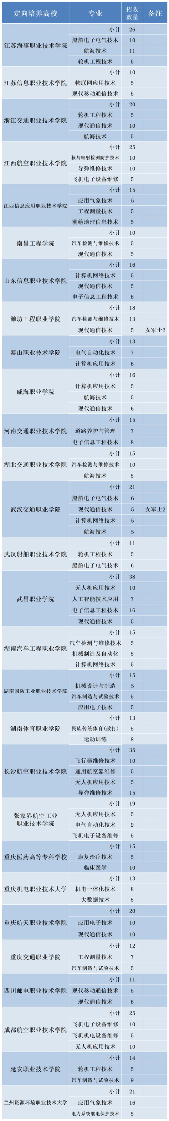 在國家核定面向云南省招生的28所定向培養高校2024年高職(專科)層次招生計劃內,面向全省生源為解放軍和武警部隊招收定向培養軍士497人(含女軍士4人,具體計劃見文末附件)。有關招生計劃在教育部“全國普通高校招生來源計劃網上管理系統”中編制,“計劃類別”為“定向培養軍士生”。