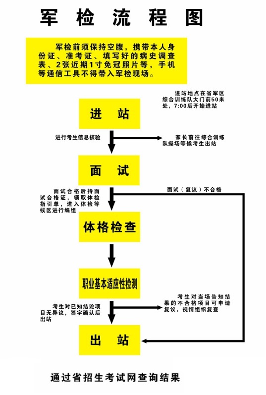 7月6日:在省軍區綜合訓練隊,集中組織對當場未告知體檢項目(化驗類)檢查結果不合格且符合復查條件的考生進行復查,同時受理對當場未告知體檢項目(化驗類)檢查結果有異議事項,復查復議時間截至當日12時,逾期不再組織。