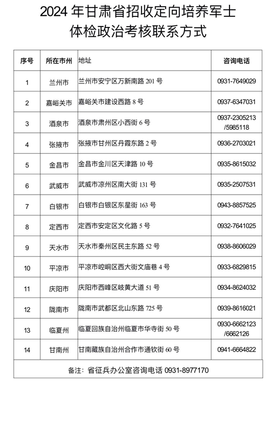 2024年甘肅省招收定向培養軍士體檢政治考核聯系方式