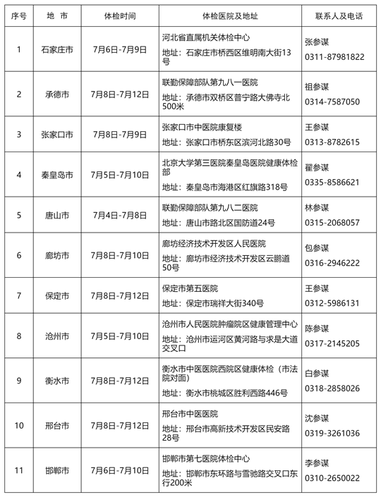注:因個別考生電話無法接通,考生在體檢日期開始前2日仍未接到當地征兵辦電話通知的,請主動聯系上表中戶籍所在地(外省戶籍為經常居住地)市級征兵辦聯系人。政治考核工作安排由戶籍所在地(外省戶籍為經常居住地)縣級征兵辦組織。請考生在規定時間內完成體格檢查和政治考核,逾期不予辦理。