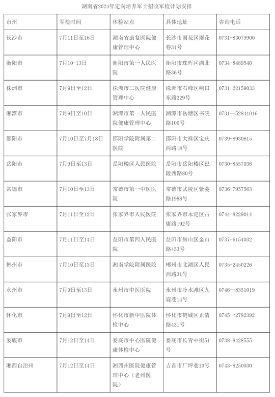 全省共設14個定向培養軍士招收體檢站,計劃安排如下。考生可根據當地市、縣人民政府征兵辦公室電話、短信、微信、公告等通知前往體檢站參加軍檢,逾期不參加者不予補檢,請考生注意保持手機暢通。