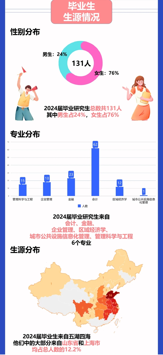 學院2024屆研究生畢業生共計131人,畢業去向落實率98.47%,簽約率92.37%,蟬聯全校商科第1。就業質量穩步提升,4名研究生畢業生獲“上海大學畢業生就業攀登獎”。