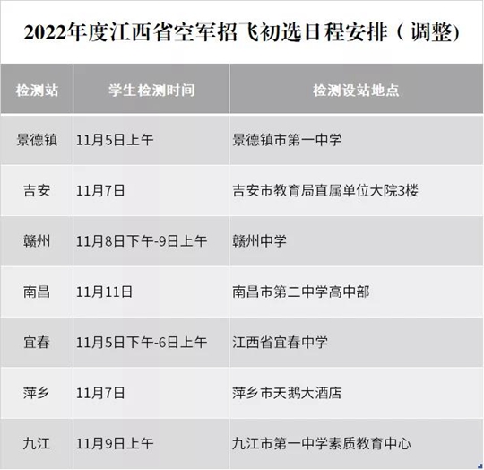 因受疫情影響,江西省空軍招飛初選檢測安排現(xiàn)調(diào)整如下: