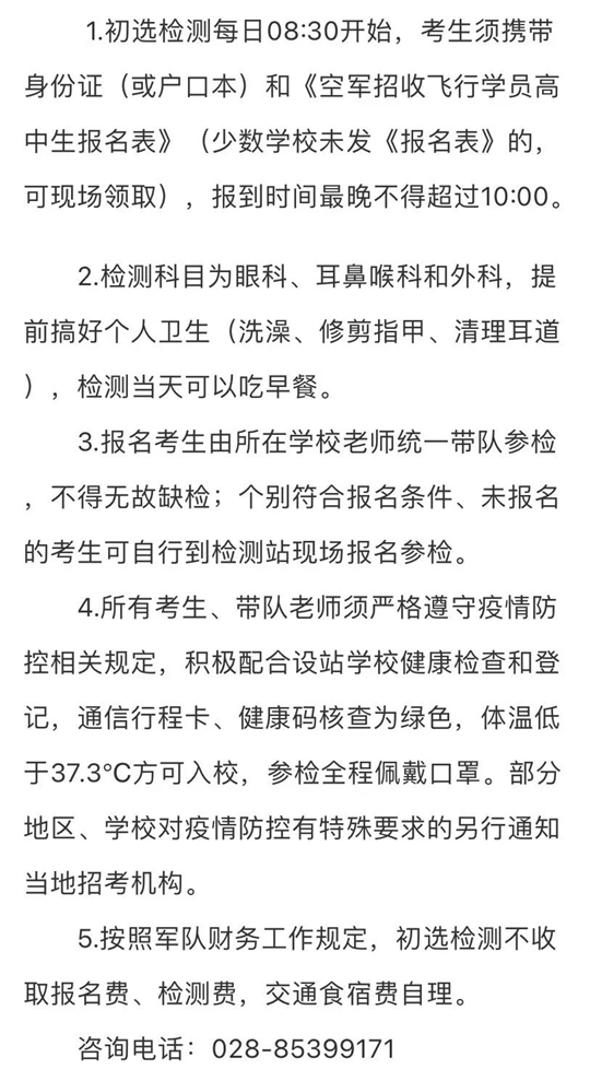 根據2022年度空軍招飛工作安排,2021年10月10日至20日,空軍招飛局成都選拔中心將派初選檢測組赴相關市(州),對報考空軍飛行學員的學生進行檢測。