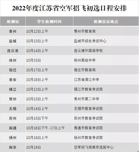 根據2022年度空軍招飛工作安排,10月12日至10月19日,空軍招飛局南京選拔中心將派初選組赴各地市,對報考空軍飛行學員的學生進行檢測。