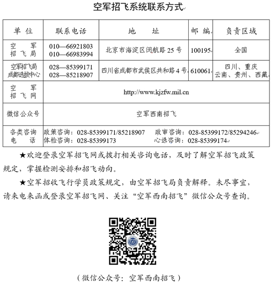 望廣大家長積極支持并鼓勵孩子報考空軍飛行學員!如需了解更多招生資訊,歡迎通過《招生簡章》上的聯系方式咨詢。