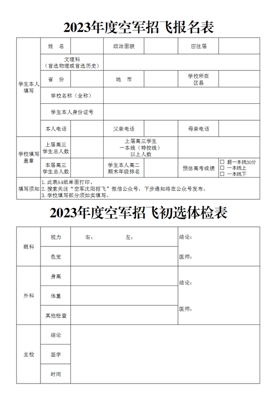 2023年度空軍招飛報名表