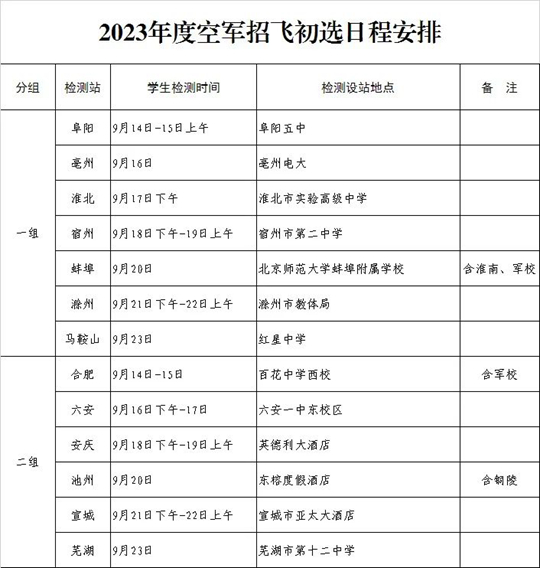 根據(jù)2023年度空軍招飛工作安排,9月14日至9月23日,空軍招飛局南京選拔中心將派初選組赴各地市,對(duì)報(bào)考空軍飛行學(xué)員的學(xué)生進(jìn)行檢測(cè)。