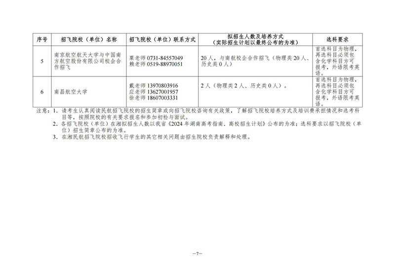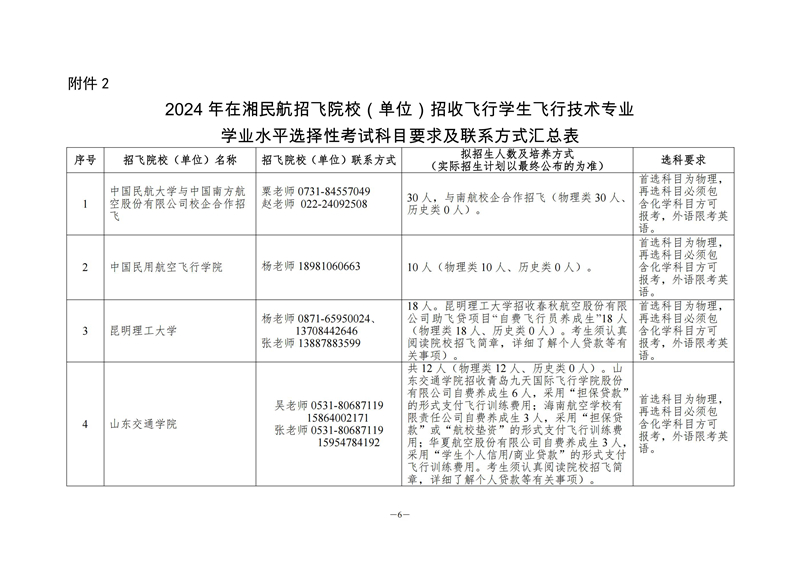 2.2024年在湘民航招飛院校(單位)招收飛行學生飛行技術專業學業水平選擇性考試科目要求及聯系方式匯總表