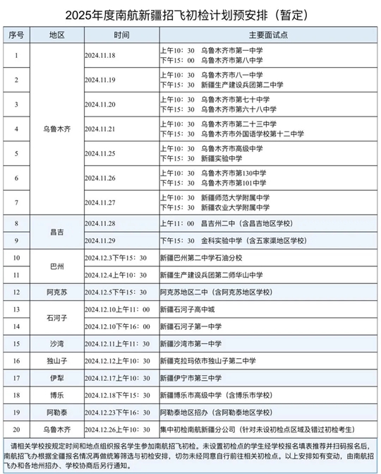 初檢面試預安排如下(暫定),招飛辦根據(jù)全疆報名情況統(tǒng)籌安排初檢面試,詳細面試安排待明確后會再次發(fā)布。