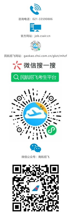 2.中國南方航空股份有限公司從未委托任何培訓機構或個人開展招飛工作,敬請廣大考生及家長提高警惕,謹防受騙!經本公司招飛合格的學生,除參加體檢(含心理測試)需繳交必要費用外,不需繳納任何形式的推薦費、介紹費、招待費、活動費、中介費等任何費用!