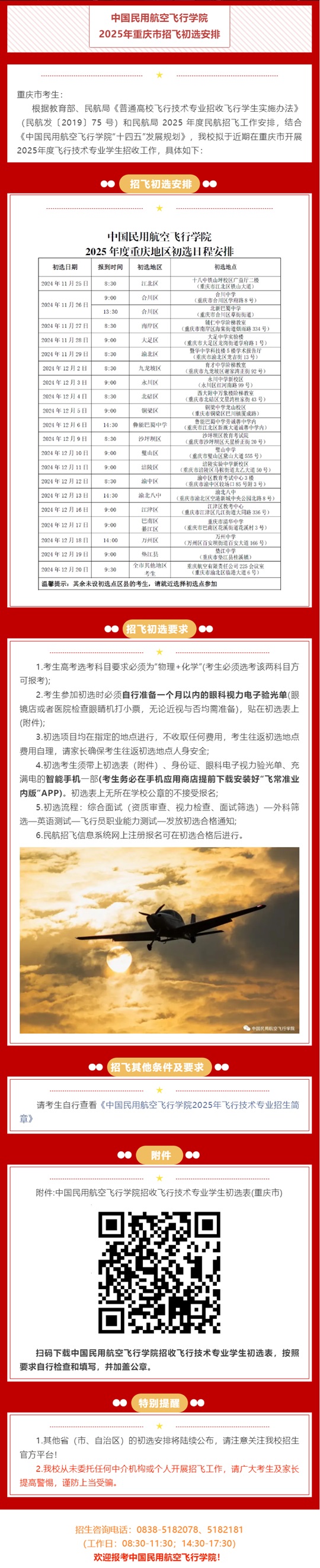 中國民用航空飛行學院2025年重慶市招飛初選安排