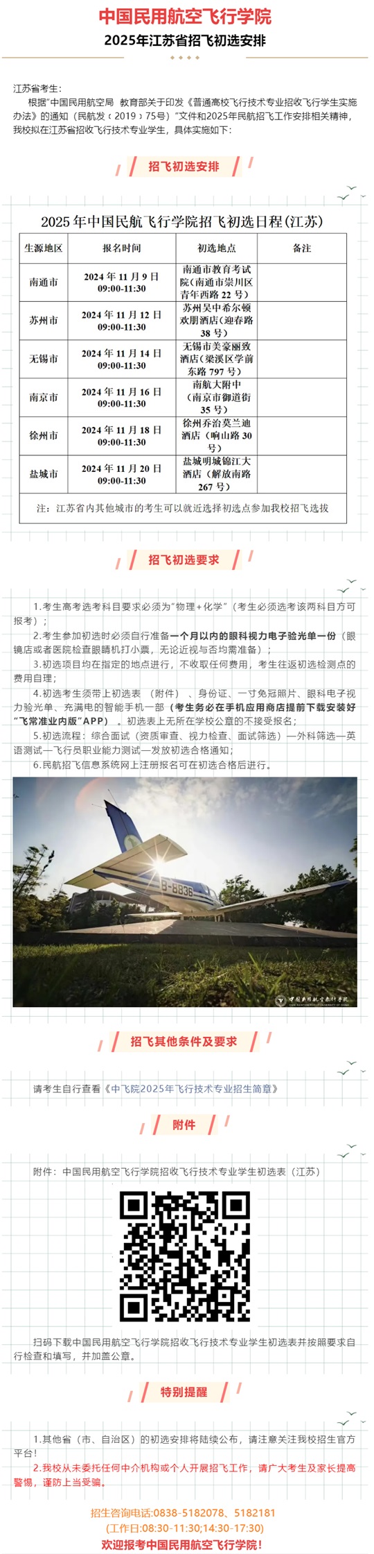 中國民用航空飛行學院2025年江蘇省招飛初選安排