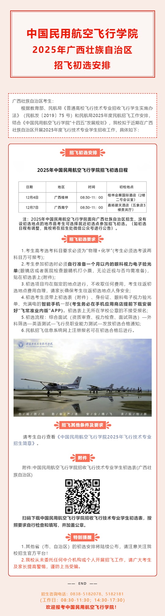 中國民用航空飛行學院2025年廣西壯族自治區招飛初選安排
