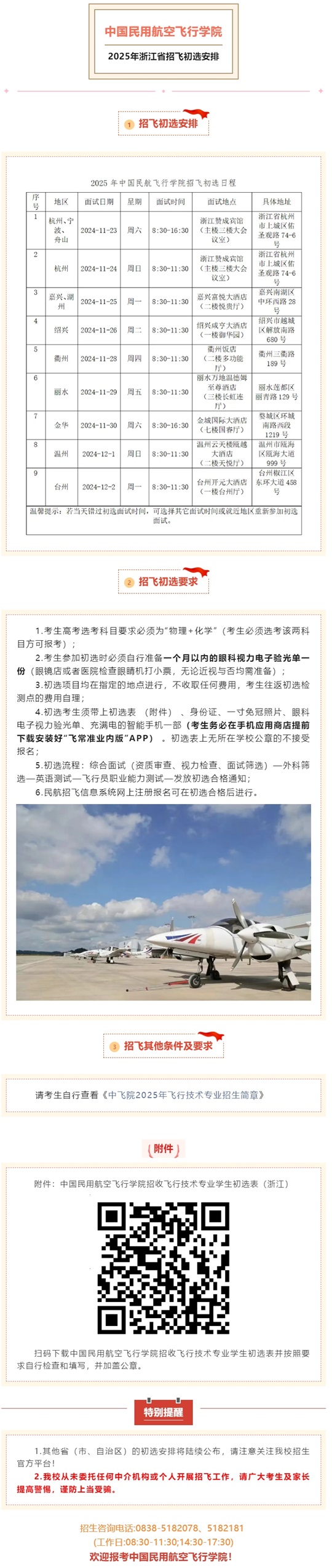 中國民用航空飛行學院2025年浙江省招飛初選安排