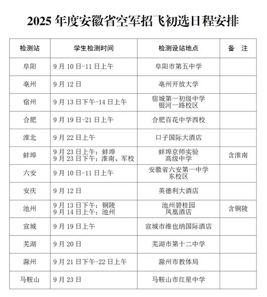 根據2025年度空軍招飛工作安排,9月10日至9月23日,空軍招飛局南京選拔中心將派初選組赴各地市,對報考空軍飛行學員的學生進行檢測。
