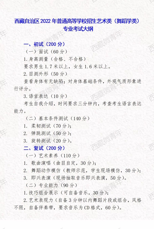 西藏自治區2022年普通高等學校招生藝術類(舞蹈學類)專業考試大綱
