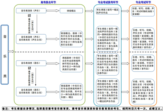 專業考試階段,兼考音樂表演類和音樂教育類的考生,相同科目只考一次,成績互認。如考生兼考音樂教育類,但未參加相應的副項考試,其音樂教育類考試總成績為零。
