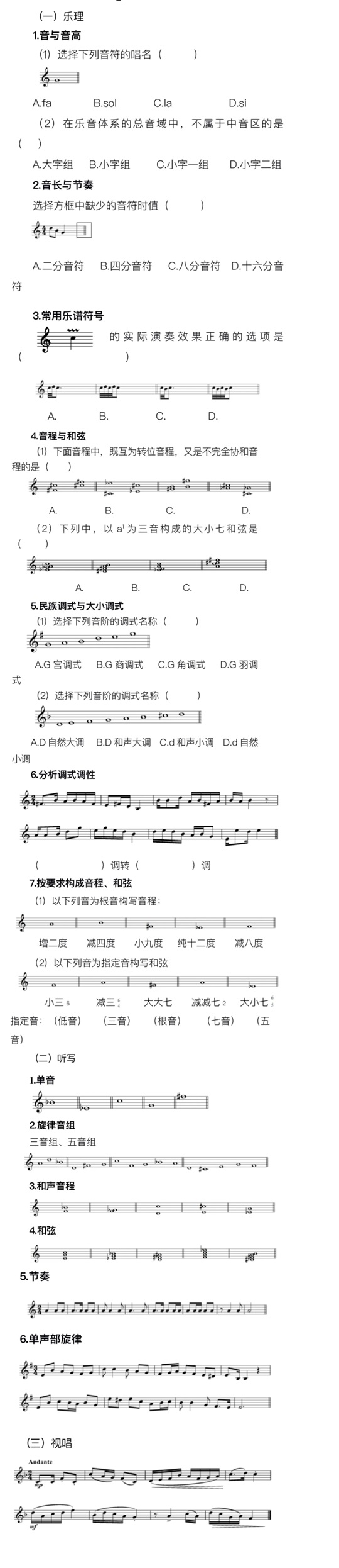 3.考試形式:采取筆試方式,使用五線譜記譜,提供標準音a1參照。