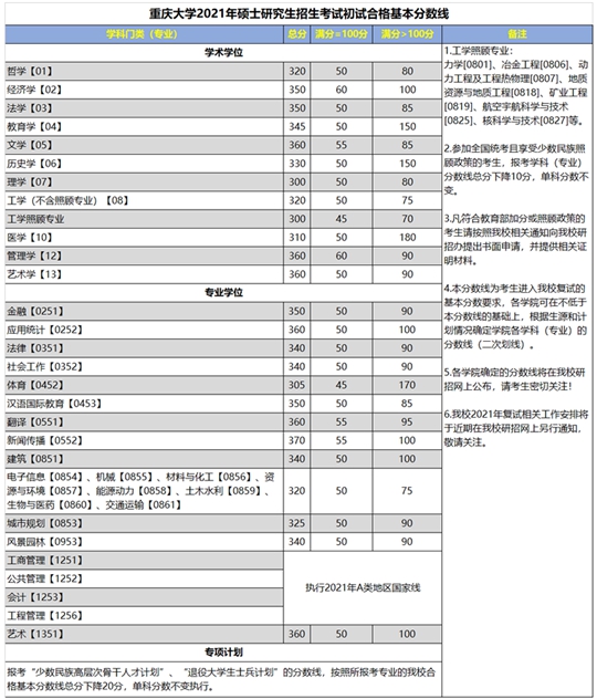重慶大學2021年全國碩士研究招生考試初試合格基本分數線