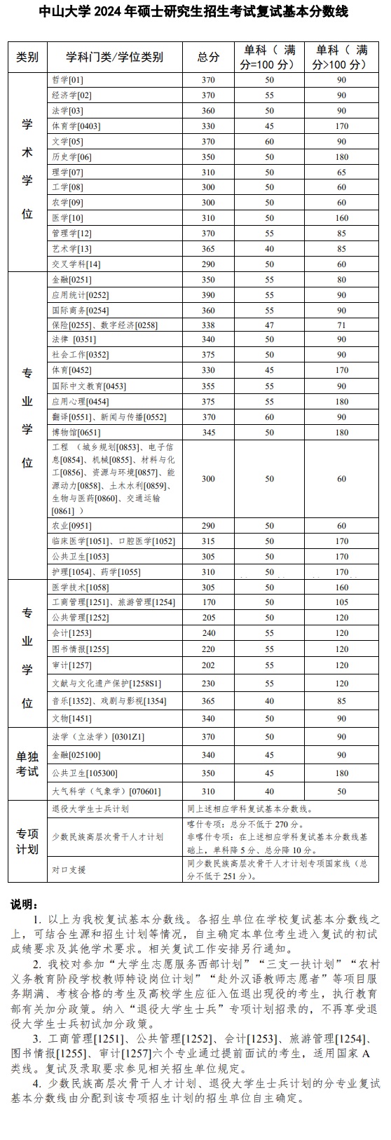 中山大學2024年碩士研究生招生考試復試基本分數線