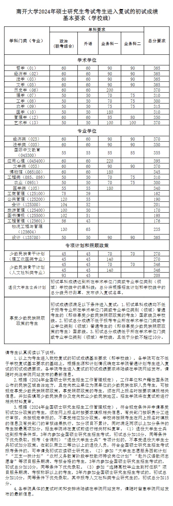 南開(kāi)大學(xué)2024年碩士研究生考試考生進(jìn)入復(fù)試的初試成績(jī)基本要求(學(xué)校線)