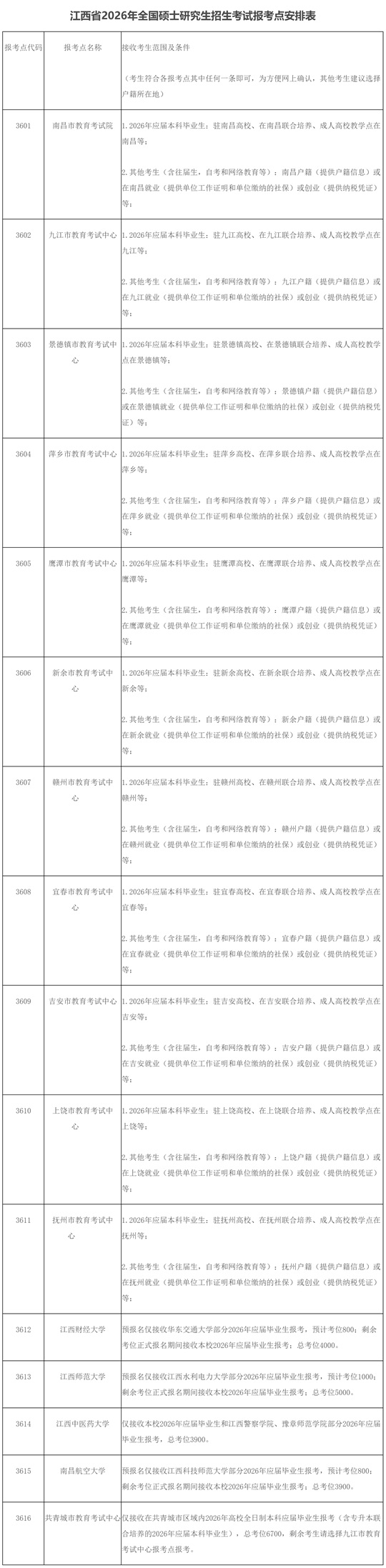 附件:江西省2026年全國碩士研究生招生考試報考點安排表