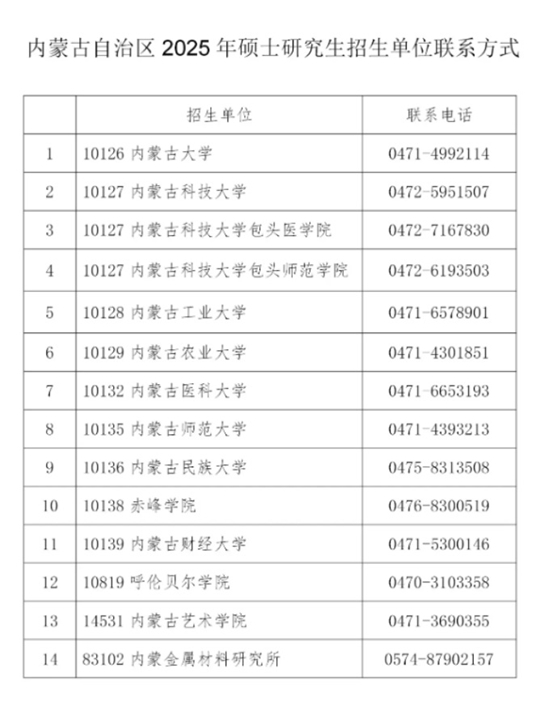 附件:內蒙古自治區2025年碩士研究生招生單位聯系方式