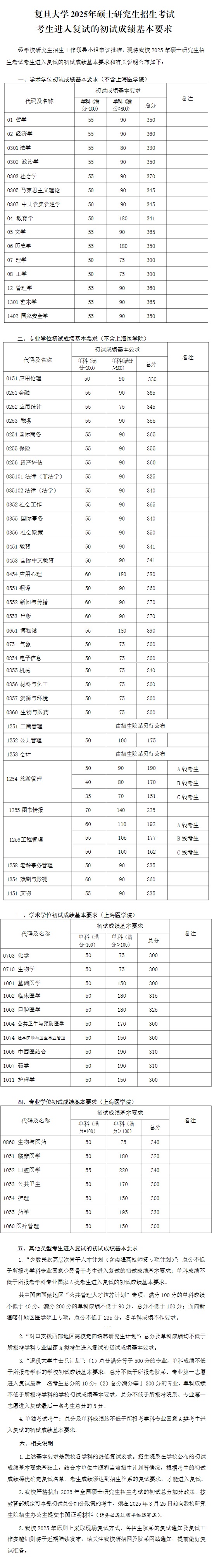 復旦大學2025年碩士研究生招生考試考生進入復試的初試成績基本要求