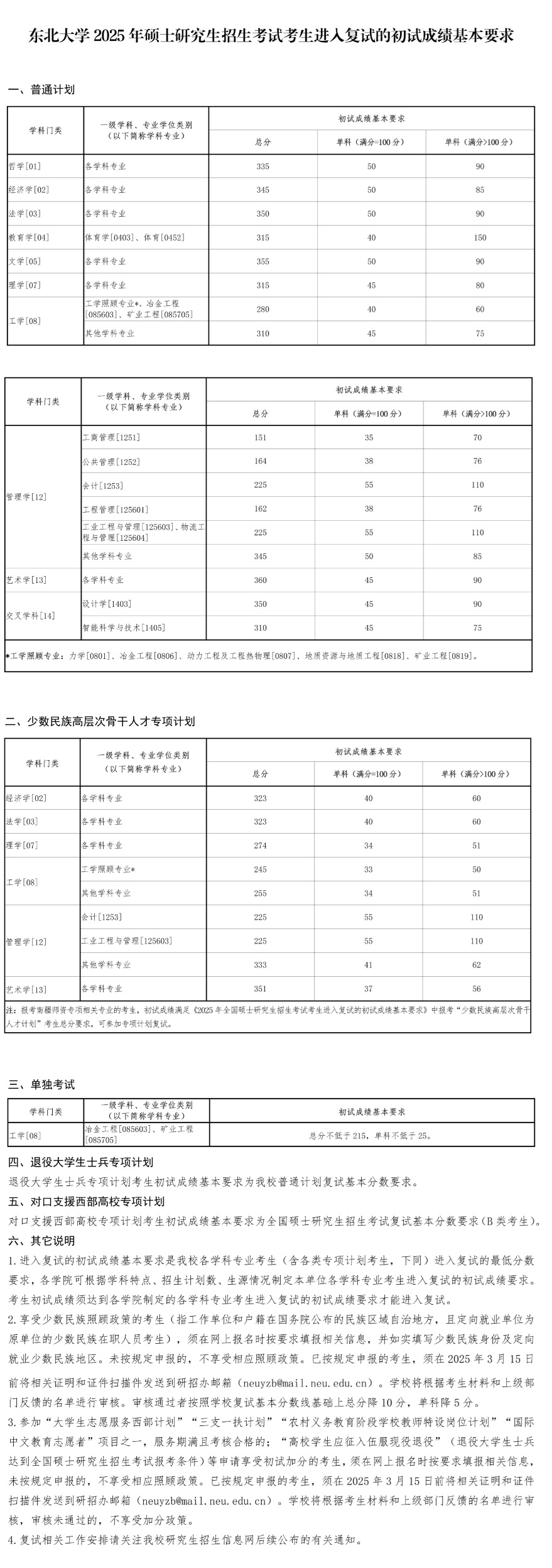 東北大學2025年碩士研究生招生考試考生進入復試的初試成績基本要求