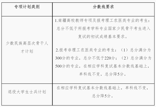 3.我校少數民族照顧政策按照教育部《2025年全國碩士研究生招生工作管理規(guī)定》執(zhí)行。工作單位在國務院公布的民族區(qū)域自治地方,且定向就業(yè)原單位的少數民族在職人員考生,申請享受照顧政策的,須在網上報名時按要求填報相關信息。未按規(guī)定申報或審核未通過的,不享受照顧政策。學校將根據考生材料和有關部門反饋的名單進行審核。審核通過者可在相應普通計劃學科分數線基礎上總分降5分或一門單科降5分,考生在享受照顧政策后,分數不得低于享受少數民族照顧政策國家線有關要求。
