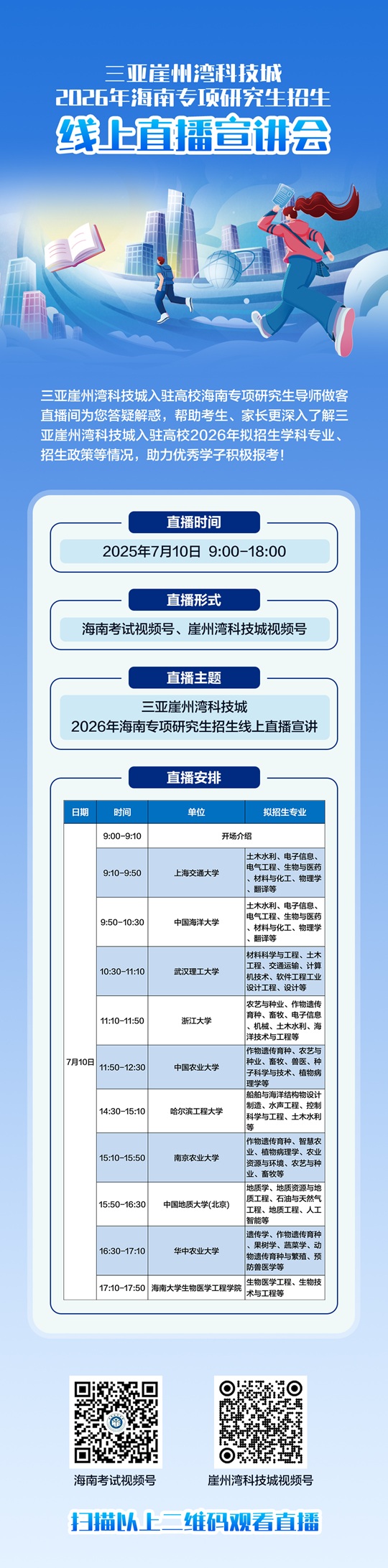 研考︱三亞崖州灣科技城2026年海南專項研究生招生線上直播宣講會預告